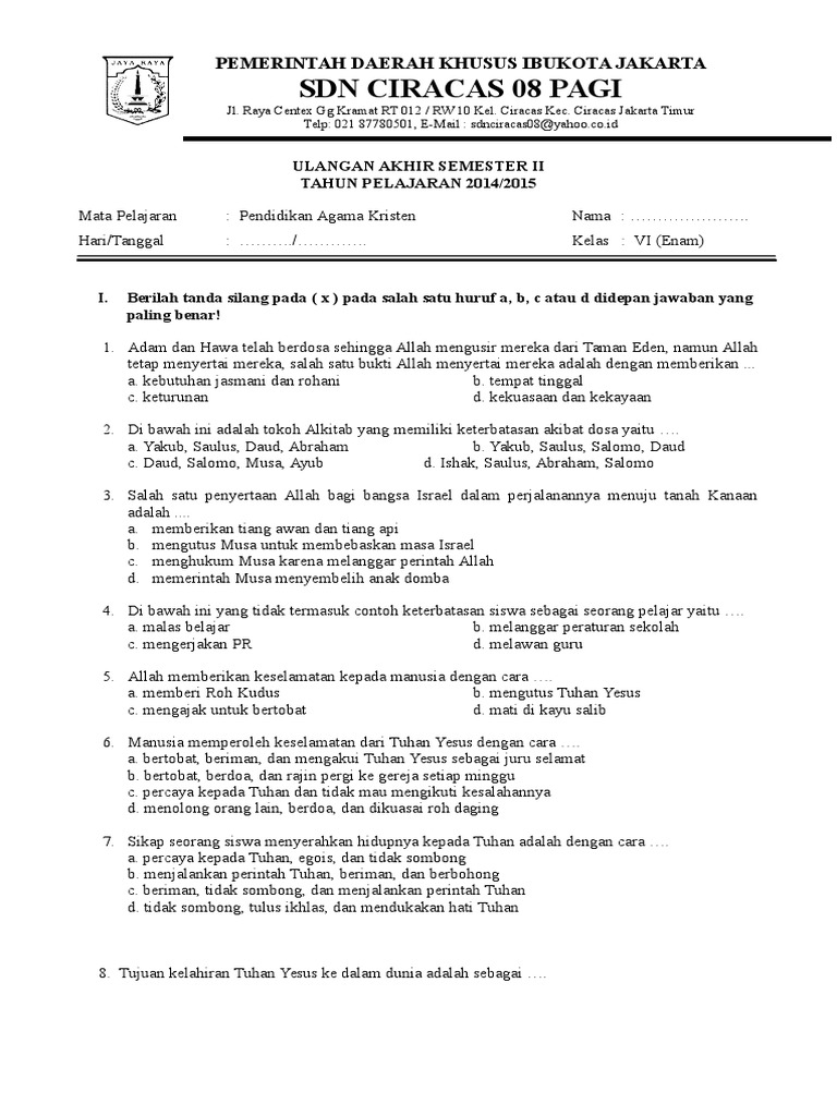 Soal agama kristen kelas 6 semester 1 dan kunci jawaban.